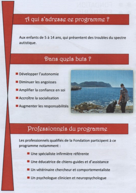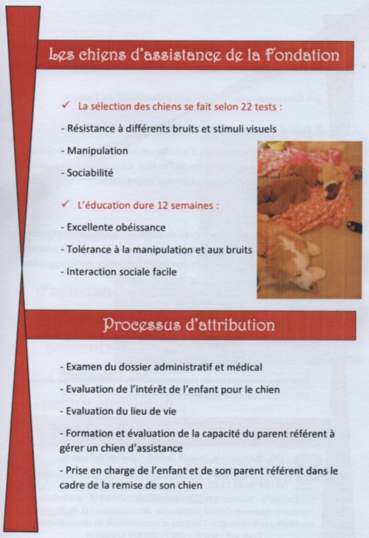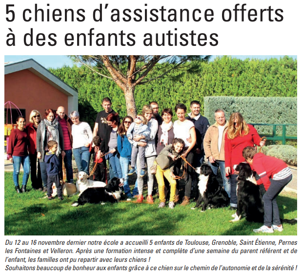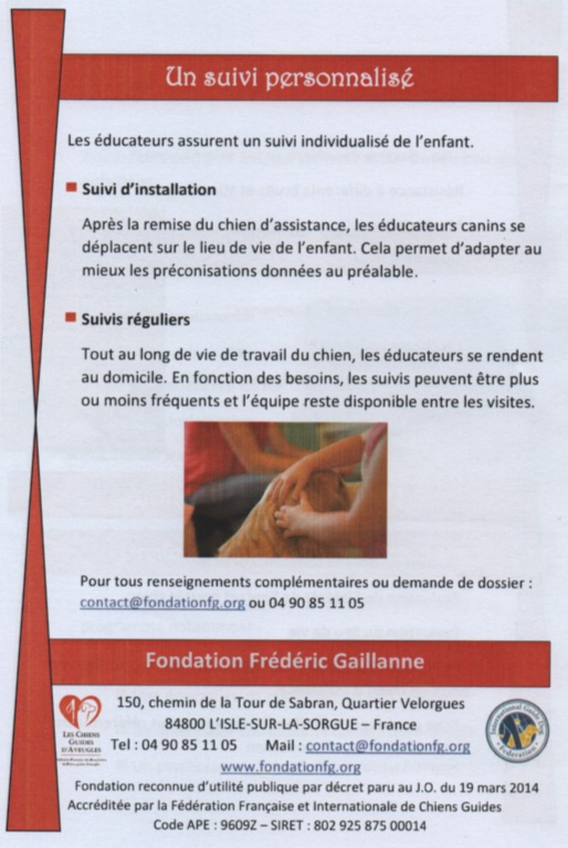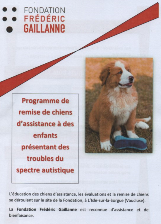 « Nous avons Lorka, chien d’assistance depuis le 12 novembre dernier. Date à laquelle nous sommes allés dans le Vaucluse à la Fondation Frédéric Gaillanne. Cette fondation est la seule en Europe à offrir des chiens guide à des enfants aveugles et depuis peu à des enfants avec TSA.